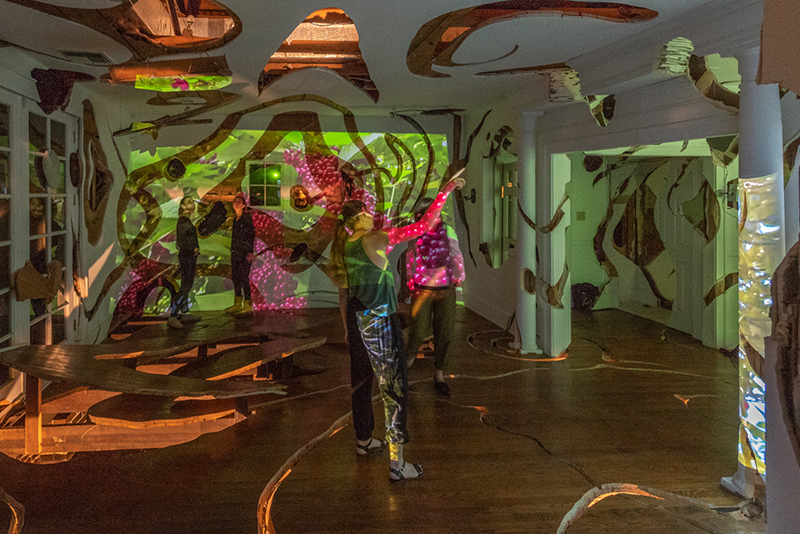 "Inside/Out" (2018) is a multi-channel video installation in conversation with Ripple, a sculptural intervention by collaborative team Havel and Ruck Projects. Hunter creates site-specific films that are projected throughout the interior of the bungalow. Hunter's work observes the exposed framework of the home and the natural beauty surrounding it. In response, Hunter's Inside/Out layers lush greenery over the bare walls with her films of grass, pine needles, and leaves, which we sometimes forget are alive. As Ripple remind us how we grow the spaces that shape our lives, Inside/Out asks us to consider the planted environment that grows with us.